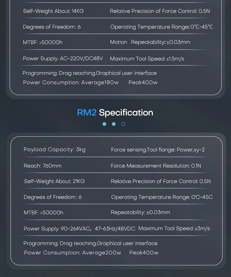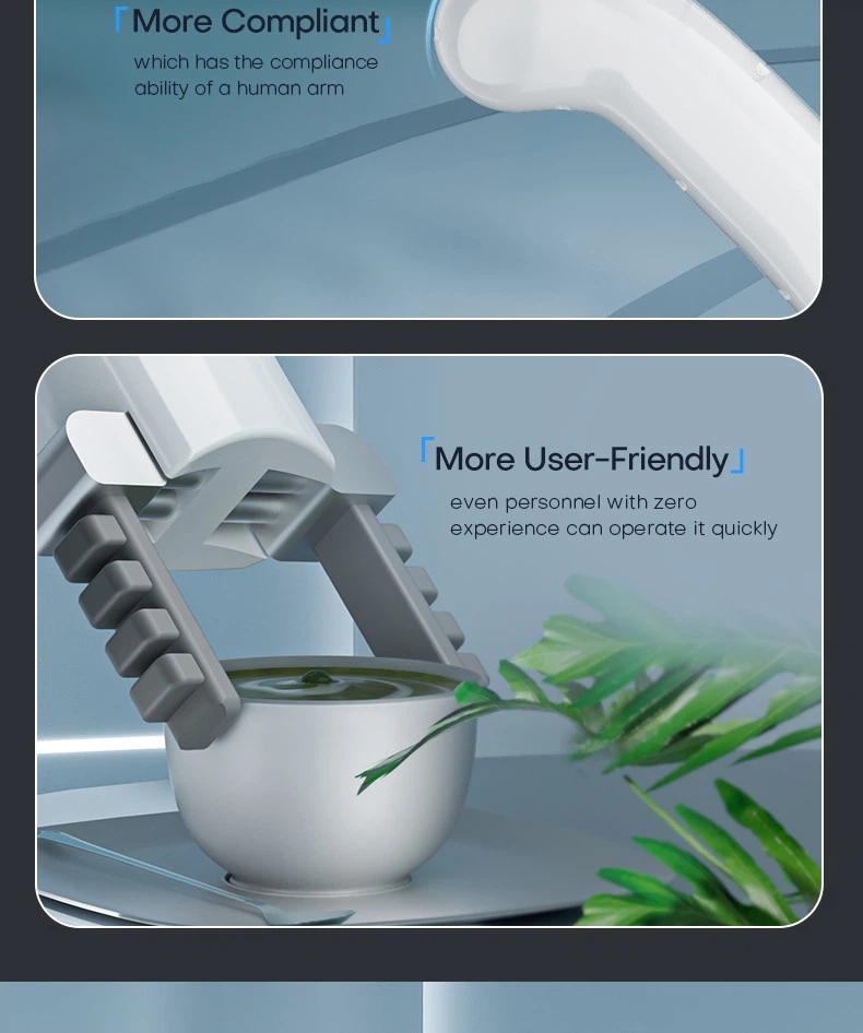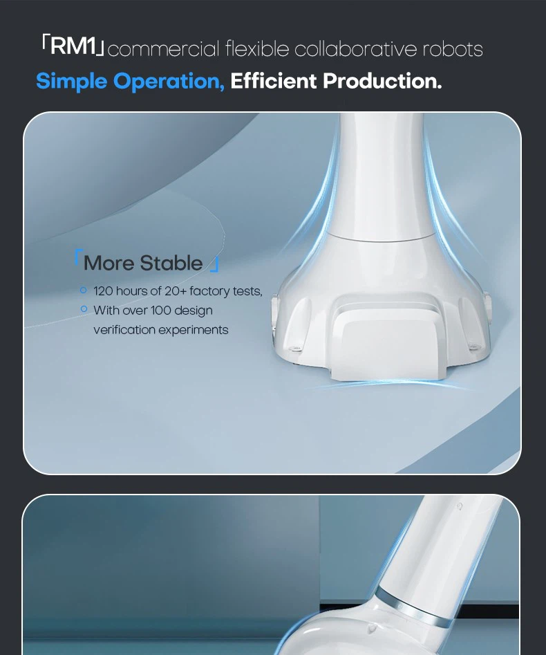 Thế hệ robot cộng tác linh hoạt thương mại mới của Reeman được trang bị cảm biến mô-men xoắn toàn khớp và công nghệ điều khiển lực trực tiếp với phản hồi trạng thái đầy đủ, cho phép tránh chướng ngại vật linh hoạt hơn và phát hiện va chạm nhạy hơn. Nó có khả năng điều khiển lực động cao và khả năng điều khiển mềm đồng thời đảm bảo điều khiển vị trí có độ chính xác cao. Được thiết kế riêng cho các tình huống thương mại, nó đáp ứng rất nhiều nhu cầu về ngoại hình, độ an toàn, độ tin cậy và dễ sử dụng, tạo ra trải nghiệm tương tác giữa người và máy thân thiện hơn.