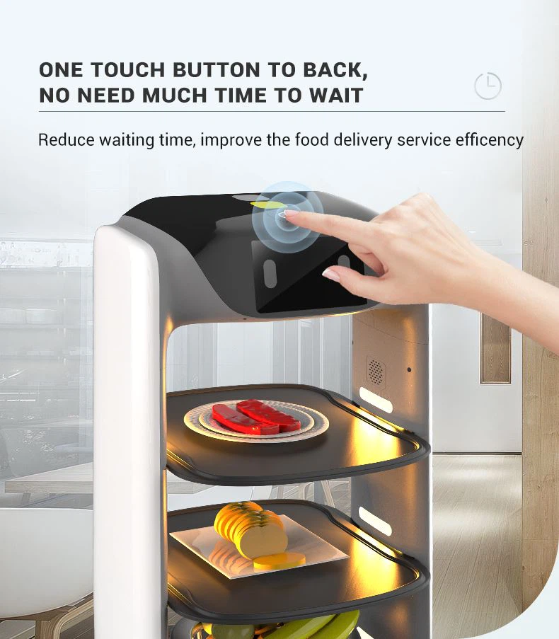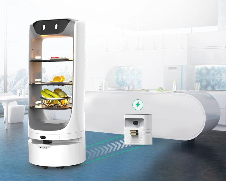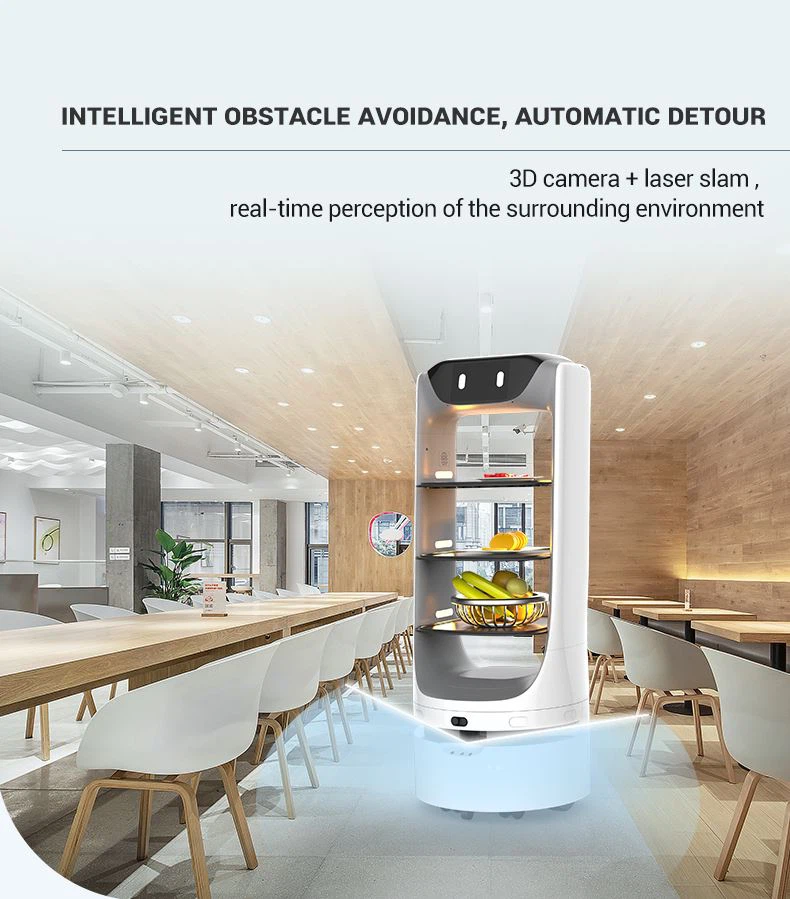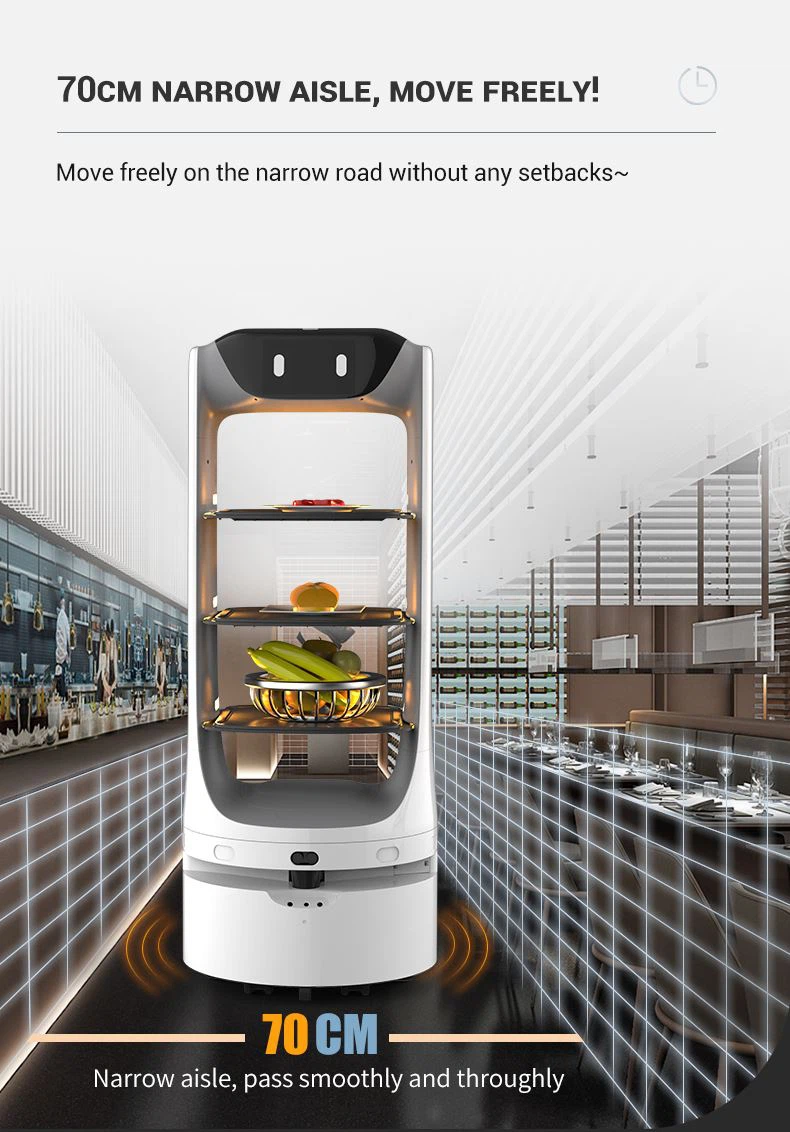 Robot giao đồ ăn có thể giao thức ăn đến bàn một cách hiệu quả và chính xác và thực hiện nhắc nhở thông minh, sạc tự động, nhắc trạng thái hoạt động.