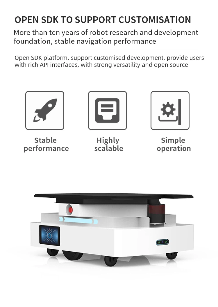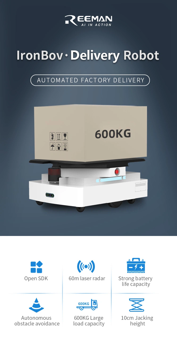 lronBov· Robot giao hàng có khả năng tự động điều hướng và tránh chướng ngại vật. Khả năng chịu tải có thể đạt tới 600KG, chiều cao nâng là 10cm và SDK mở cung cấp cho bạn khả năng tùy chỉnh đa dạng. Đồng thời, nó sử dụng pin lithium sắt phosphate, có độ bền cao, an toàn và thân thiện với môi trường, và có vòng đời là 3000+ lần.