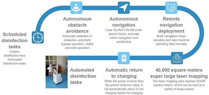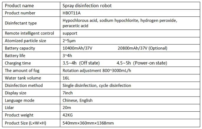 Robot hun khử trùng thông qua phun khử trùng. Thao tác bản đồ có thể được xây dựng thông qua một ứng dụng di động, phương pháp khử trùng tùy chỉnh thuận tiện hơn, Một loạt các vòi phun có sẵn.